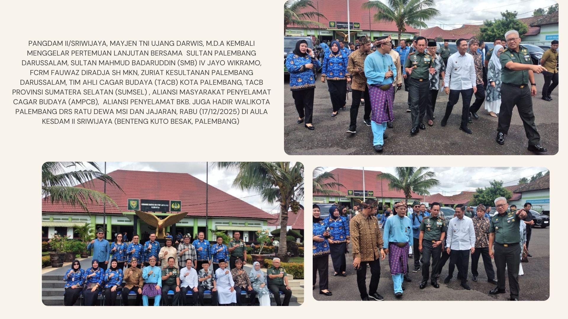 Pangdam II/Sriwijaya Mayjen TNI Ujang Darwis, M.D.A kembali memimpin pertemuan lanjutan bersama Sultan Palembang Darussalam Sultan Mahmud Badaruddin (SMB) IV Jayo Wikramo, RM Fauwaz Diradja SH MKn, Tim Ahli Cagar Budaya (TACB) Kota Palembang dan Provinsi Sumatera Selatan, Aliansi Masyarakat Penyelamat Cagar Budaya (AMPCB), Aliansi Penyelamat BKB, serta Wali Kota Palembang Drs Ratu Dewa, MSi.