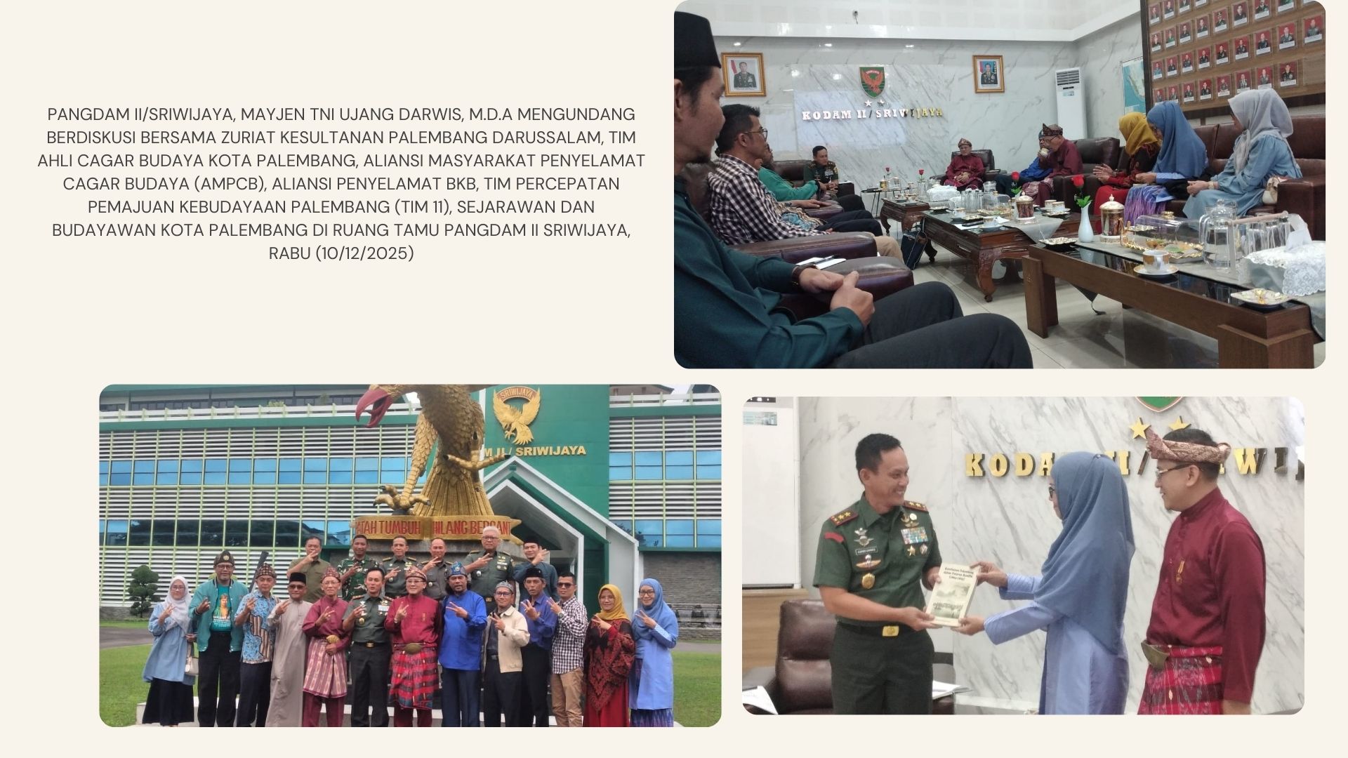 LogikaIndonesia.Com – Di sebuah ruang tamu yang biasanya berisi percakapan strategis militer, Rabu (10/12/2025) pagi itu atmosfir berubah menjadi panggung dialog sejarah. Pangdam II/Sriwijaya, Mayjen TNI Ujang Darwis, M.D.A, duduk berhadapan dengan Sultan Palembang Darussalam, para zuriat Kesultanan, sejarawan, budayawan, hingga aktivis pelestari cagar budaya. Semua hadir membawa satu kegelisahan yang sama masa depan Benteng Kuto Besak (BKB), ikon peradaban tua Palembang yang kini kembali terancam oleh pembangunan gedung tujuh lantai Rumah Sakit dr. AK Gani.