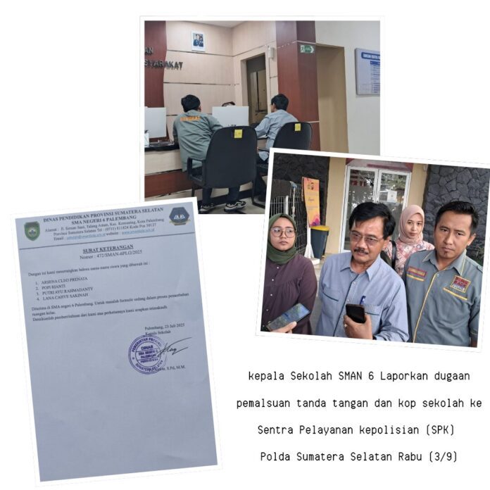 Didampingi oleh tim kuasa hukum—Novrizal Effendi, SH MH, Novria SH, dan Diah— Rabu (3/9) kepala sekolah SMAN 6 Palembang melaporkan kasus ini sebagai dugaan tindak pidana pemalsuan dokumen, sebagaimana diatur dalam Pasal 263 KUHP.