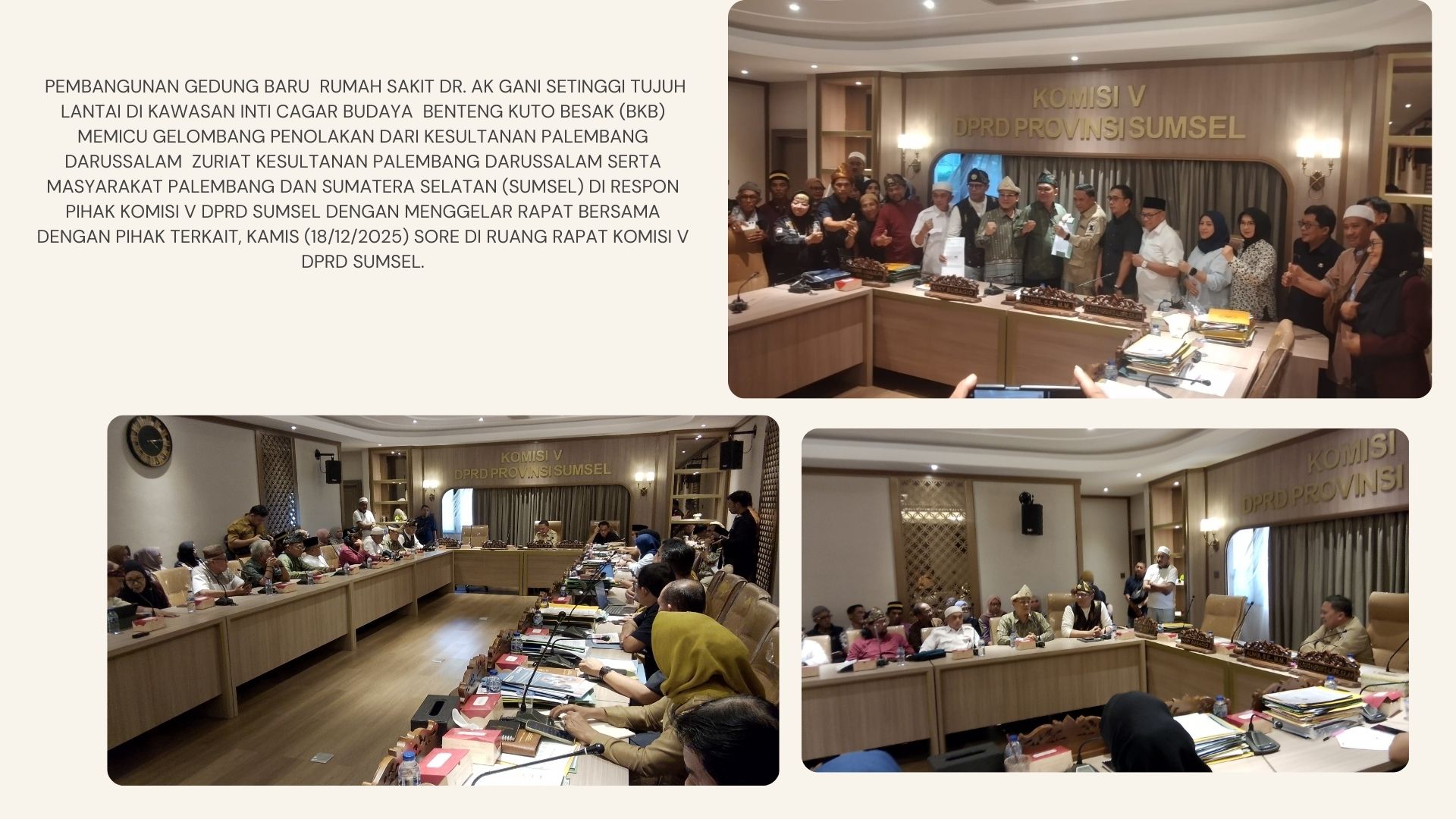Dalam rapat tersebut, Koordinator Aksi Aliansi Penyelamat BKB Raden Genta Laksana menyerahkan surat dukungan resmi dari zuriat Kesultanan Palembang Darussalam kepada Ketua Komisi V DPRD Sumsel sebagai penegasan penolakan terhadap pembangunan gedung tujuh lantai di kawasan inti Cagar Budaya Benteng Kuto Besak.