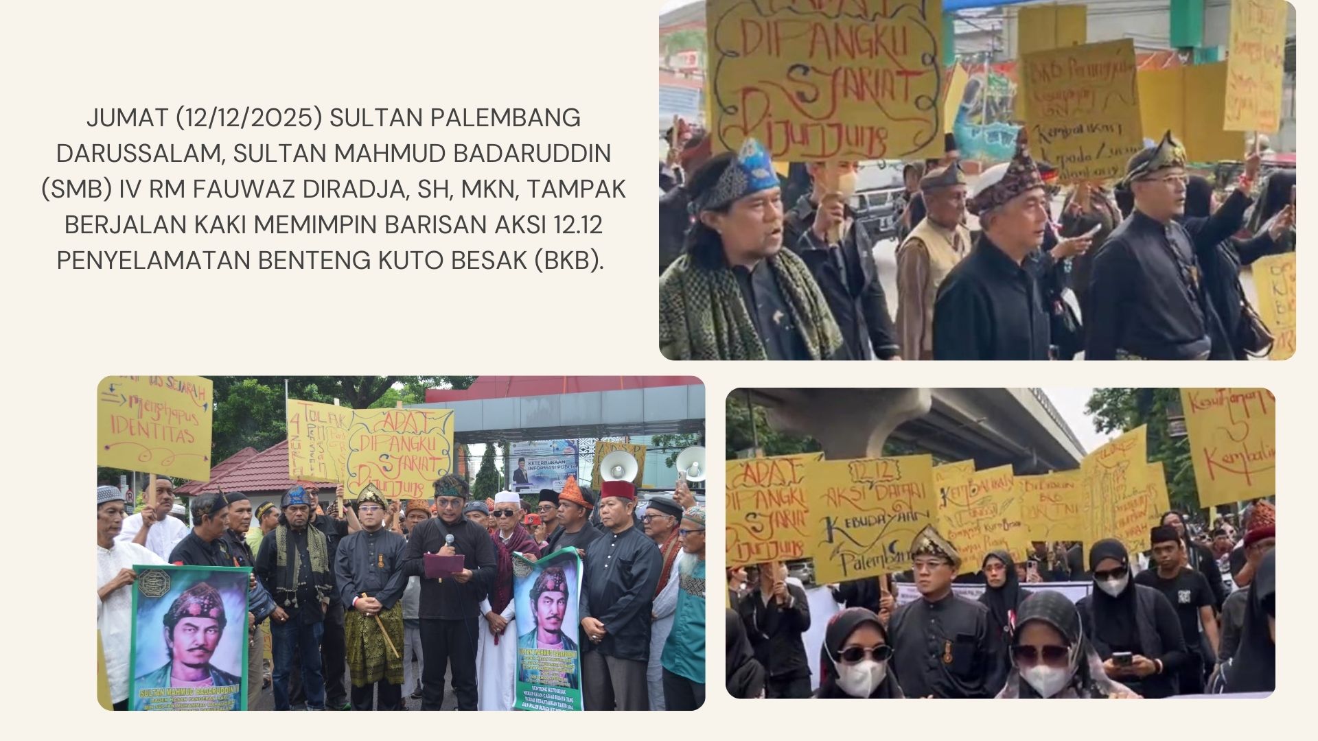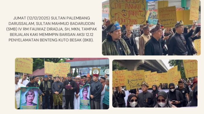 Seorang Sultan Palembang Darussalam Sultan Mahmud Badaruddin (SMB) IV RM Fauwaz Diradja, SH, MKn memimpin barisan rakyat dalam Aksi 12.12 Penyelamatan Benteng Kuto Besak (BKB). Tanpa iring-iringan, tanpa kendaraan dinas, tanpa protokol kekuasaan. Hanya tubuh, langkah, dan tekad.