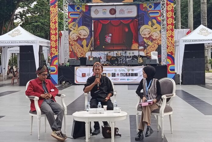 LogikaIndonesia.Com — Suasana Pelataran Lawang Borotan pada hari kedua Pekan Seni Palembang, Selasa (18/11/2025), terasa lebih hangat dari biasanya. Di antara gerbang tua dan cahaya lampu yang memantul di dinding bersejarah itu, para pengunjung berkumpul menyimak sosok pencipta lagu sekaligus budayawan Palembang: Ali Goik. Sore itu ia tampil bukan untuk sekadar bernyanyi, melainkan membuka tabir proses kreatif di balik lagu Ratu Sinuhun karya yang menggali nilai luhur Undang-Undang Simbur Cahaya, peninggalan penting Kesultanan Palembang Darussalam.