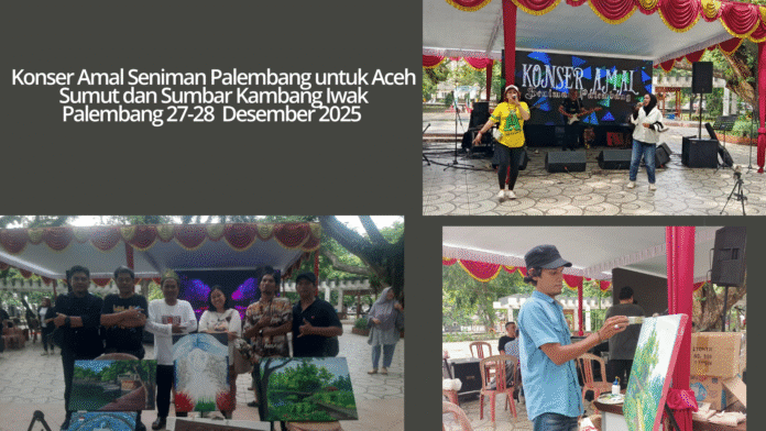 LogikaIndonesia.Com – Palembang kembali menunjukkan wajah solidaritasnya. Di tengah riuh olahraga masyarakat di Kambang Iwak Park, suara musik, lantunan puisi, hingga goresan kuas pelukis berpadu dalam satu tujuan membantu sesama. Kolaborasi konser amal antarseniman Palembang berhasil menghimpun donasi masyarakat senilai Rp 6,080,000 dalam dua hari 27-28 Desember 2025, sebuah angka yang mencerminkan kepedulian warga terhadap korban banjir bandang di Aceh, Sumatera Utara, dan Sumatera Barat.